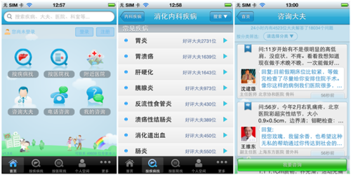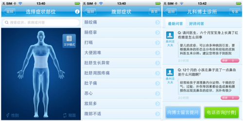 先说春雨掌上医生,和诊治相关的功能主要是症状自查和咨询医生两部分,症状自查可以通过点击一个简单的人体模型图的身体部位,筛选相关症状,并找到这些症状相关病症的资料,咨询医生则是可以通过文字,语音,和图片向医生提问求解答。虽然小编在急救和预约应用都有提到使用人体模式是未来发展的一种思路,不过在春雨掌上医生中的使用方式明显不是好例子:这种表达方式最大的作用应该在于减少交流的误差而不是自查,即使能提高自查的准确性,对于缺乏专业知识的普通病人来说,错误率稍低也于事无补,更别论在点击完部位之后出现的症状列表则是一堆医学症状学名,用户更无法正确判断自己的症状情况。而在咨询方面其实也有些多余的功能,例如还包括医院诊断和处方这类选项的图片,如果自认为能否定医院面诊的诊断,超越医院医疗的效果,未免太自满了点。每天只有200个号的问答数量更是让人无力吐槽,这个号比小米手机都难抢,无视吧。