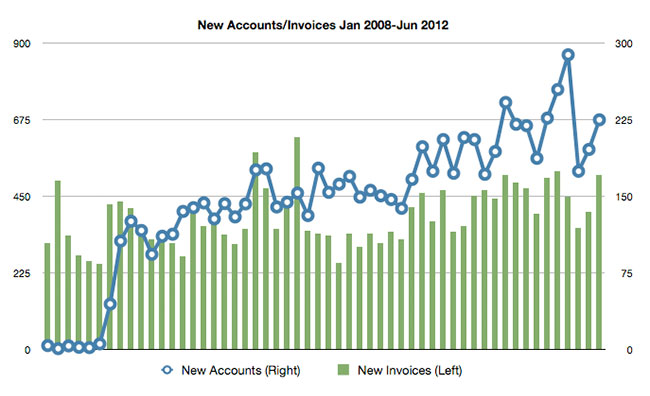 编者按:你能相信上面这份数据来自一个四年没维护的网站吗?准确的说是1532天。增长曲线异常顺化,尽管数据并不算多,但是如果你知道没有任何宣传与推广,就足够表达自己的惊诧,就像是一个被荒废的花园静悄悄开出美丽的花朵。 Ryan Detzel在四年前开发了这个网站“Invoice Journal”,用来方便商户给客户开具单据,但看起来这更像是一个测试性的项目,他并没有计划商业化运作,所以只是悄悄放在服务器上运行。但是四年后的一通电话,重新唤起了他对这个“遗忘项目”的记忆。 一天,我在度完假回家的路上接到一个电话。这是一个纽约的号码,不在我的通信录里,通常这样的电话我都不接,可是因为我弟弟在纽约,我想可能是他的一个朋友弄错了,所以我就应答了。电话的另一端是一个很怯懦的声音,她非常谨慎的问,“你好,是Invoice Journal网站?(译注:一个保存单据的网站)”。 我犹豫了,在Invoice Journal上线4年多的时间里,我从来没有接到过一个电话,瞬时间,在我支吾的说出“是的”之前,千万思绪一下都涌进我脑子里。“那好,是这样的,你能告诉我网站什么时候能恢复吗?我所有的单据都在里面,没有它我没法生活。”她说着。“我真的需要我的这些单据,如果网站不能够恢复,你能否把我存在系统里的单据发给我?” 那好,是这样的,你能告诉我网站什么时候能恢复吗?我所有的单据都在里面,没有它我没法生活。 这个嘛,起初我有点犹豫,因为四年来我从未管理过Invoice Journal。我把它给忘了,丢在脑后了,从我的记忆里删除了,但这个柔软的声音让我知道,虽然我忘记了它,但她却没有,事实上她的生活依赖着它。我很惊奇。被人发现不尽职,并且不确定是什么原因网站罢工,我告诉她我在开车中,但我会在到家后马上检查,让网站恢复,让她可以用。通话结束了,在接着的2小时里,Invoice Journal不断的在我脑子里跳跃。 Invoice Journal是我闲着没事时做的一个网站,开发它填补了我每天上下班做地铁的时间。每天在地铁上我都有两个小时的空闲时间,所以我想为什么不做点什么呢,我自己能用,而且过程中还能学到新东西。出于当时我做了很多的兼职工作,而且是个很抠的人,我不大喜欢Freshbooks这样需要付费的管理单据的系统,我决定开发一个自己的。从开始到结束,它只花了我几个月在地铁中的时间,开发的过程中,我又决定把它做的很时髦,完工后让所有人都能使用它。我从来没想过事情会真的这样发展,不知道有人会真的把单据存到里面。我错了。 那天晚上到家后,我检查了服务器,不知什么原因Apache停了。也许是上周我弄乱了配置文件,没有纠正里面的一个错误。动了几下键盘后,它重新运行了。为了了结这个事件,我给那个女人发了一个简短的邮件,她回谢了我。由于长假期旅行的疲劳,我上床睡觉去了。 第二天在淋浴时我又想起来Invoice Journal。我好奇,有多少人仍在使用这个系统?还有人注册新帐户吗?我设置了一个提醒(感谢siri)晚上去查看统计信息。几个SQL查询后,让我意想不到,我看到了这个: