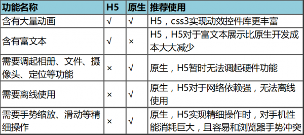 公司最近遇到了两个项目,在选择H5还是原生上面纠结了好一阵,用原生的话,老版本无法兼容;用H5的话,功能及页面过于粗糙,开发出来的效果无法满足需求。 在这种情况下,产品该如何决策,某个功能用H5还是原生来实现呢? 本文通过对H5和原生异同点的梳理,希望能够对以后产品决策提供帮助。分为以下三部分: 如何区分一个页面是H5还是原生 H5和原生可实现功能列举 如何确定一个项目用H5和原生 5种方法区分页面是H5还是原生 1.看断网的情况 把手机的网络断掉,再点开页面。 可以正常显示页面内容或是有网络诊断引导就是原生; 显示404或错误页面的是H5页面。 2.看加载的方式 新打开一个页面,看导航栏下面是否有一条加载线。 如果没有,就是原生的。 如有,这个页面就是H5页面;比如微信里面打开我们的H5页面常见的有个绿色的 加载线条。 3.看下拉刷新的情况 前提是APP有下拉刷新,此时下拉页面: 如果没有明显页面变化,或是有动态下拉刷新loading图,是原生; 如果页面闪了一下,或是显示该网页由XXX提供,是H5页面。 注:有的APP并没有下拉刷新,此时即使用H5,下拉也没有任何反应。 4.看复制文章的提示 如果页面有大段文字,长按页面后: 如果出现文字选择、粘贴功能的,是H5; 长按无反应,或是出现APP独有的复制按钮的,是原生。 注:有些原生APP自身也开发了复制粘贴功能,有的H5的css屏蔽了复制选择功能等等。此种判断依据误差较大。 5.看布局边界(限安卓) 可以在设置中打开【开发者选项】中的显示布局边界。 在页面元素很多的情况下布局是一整块的,是h5; 布局密密麻麻的是原生。 有什么是H5或是原生的独有功能 随着前端技术的发展,H5可以实现的功能及效果已经越来越接近原生APP。 但仍然有些技术壁垒由于平台性能等无法攻克,下表列出了H5和原生能实现的常见功能及推荐,在遇到面临包括此种功能的需求时,可以直接据此判断用何种技术来实现。 【H5及原生可实现功能列表】