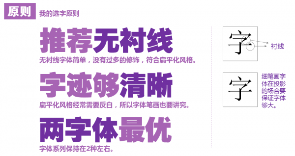 PPT主要靠逻辑说服听众,原型主要靠用户页面展示让团队清楚信息流程和展现样式,所以没必要在字体上做文章,中文字体微软雅黑和英文字体MS YAHEI非常适合PPT的一种无衬线字体,如果微软雅黑的粗体依然不够,可以考虑下载 方正超粗 并且黏贴到到windows/Fonts的文件夹。 如果文字放在单色背景上时,文字颜色和背景颜色一定要对比度够大,不可使用色彩相近颜色填充。
