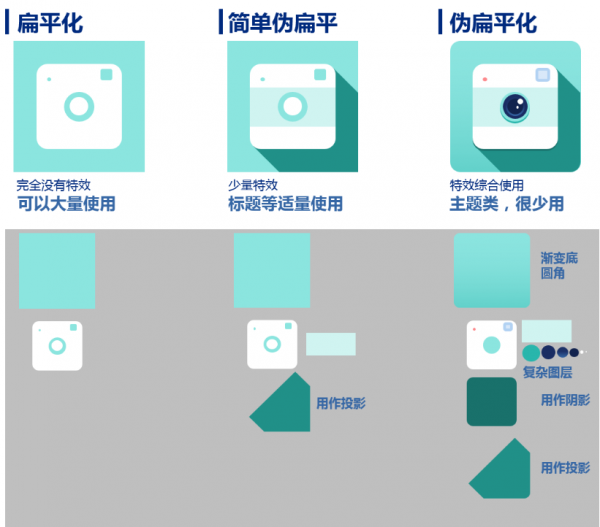 5、扁平化设计(扁平化、简单伪扁平化和伪扁平化) IOS和Android设计规范引领了设计趋势,现在互联网产品、海报和PPT设计均从拟物化向扁平化发展,而什么是扁平化呢?扁平化可以简单的分为三种:真的扁平化,简单伪扁平化和伪扁平化。真的扁平化没有阴影明暗变化,简单伪扁平化有阴影但是没有高光和细节,扁平化有阴影,有高光和细节,如下图所示,附设计方法,建议大家模仿制作一次,模仿是学习设计的最好方法。