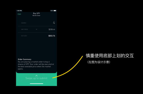 特性四:鸠占鹊巢 如果你的 App 带有「底端上划」这样的炫酷操作,Apple 的建议是:少侠要不你还是重新考虑一下?因为这个交互我们已经占了。 美国著名的股票交易软件 Robinhood 就使用了类似的交互。在买入/卖出股票这样的关键操作里,它使用了「底部上划」。尽管不是严格意义上的「底端上划」,但虚拟 Home 指示条的介入无疑增加了误操的机率。在 iPhone X 设计时,类似这样涉及到屏幕底部上下滑动的交互都需要更谨慎的思考、更严格的测试。