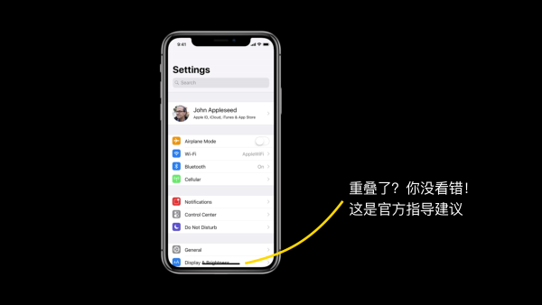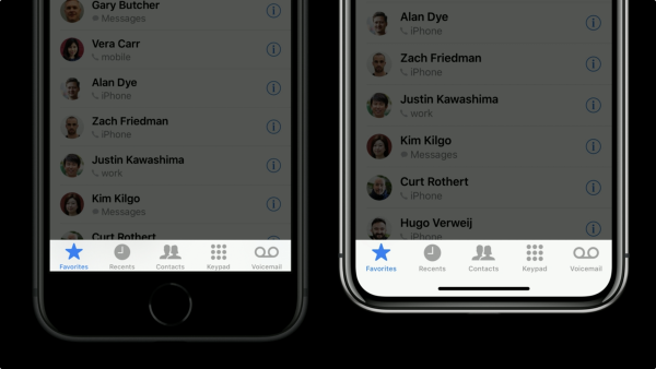 iOS 自带的通讯录是一个典型的带有底部导航栏的 App,对比 iPhone 8 和 iPhone X,你会发现在 iPhone X 上,底部导航栏并不在真正的「底部」,它是悬浮在虚拟 Home 条上方的。对拥有底部导航栏的 App 而言,iPhone X 这个全面屏的「下巴」并非可用区域,它并不真的「全面」。 但同时,Apple 的设计则例中也指出,如果 App 的底部是可滚动的内容(比如一个长列表视图),那么官方给出的建议是:放心大胆地霸占整个屏幕吧!发现文字和 Home 指示条重叠了?没关系!这是官方推荐的正确做法!事实上,用户依然可以点选最下方的列表条目。这种情况下,全面屏才是真的「全面」了。
