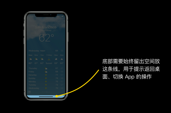 发布会谢幕了,媒体们也发完了新闻稿,朋友圈也热闹过了,接下来的工作该轮到设计师了。iPhone X 11月才发货,但你也许已经接到做适配设计的任务了。在这之前,让我们先来看看这个 iPhone X,对 UI 设计师的日常工作有什么影响。 新增的虚拟 Home 指示条——你不得不考虑的设计元素之一 iPhone X 迈向了全面屏,移除了原本在手机底部的实体 Home 键,取而代之的是一条 134 x 5 pt 的虚拟 Home 指示条。「底端上划」成为了全局性的系统操作,它可以让你返回桌面(原本的单击 Home 键),或者切换应用程序(原本双击 Home 键)。我将这个虚拟 Home 指示条的特性总结为以下五点: 特性一:如影随形 苹果在最新的开发文档中指出,这个 Home 指示条是「至关重要的系统元素」,除了在某种特殊条件下,这个指示条将永远伴随着你的 App,成为强制的设计元素出现在屏幕中。这就意味着,在你的 App 设计中你将不得不为它保留位置,并考虑好周围元素与它的兼容关系。