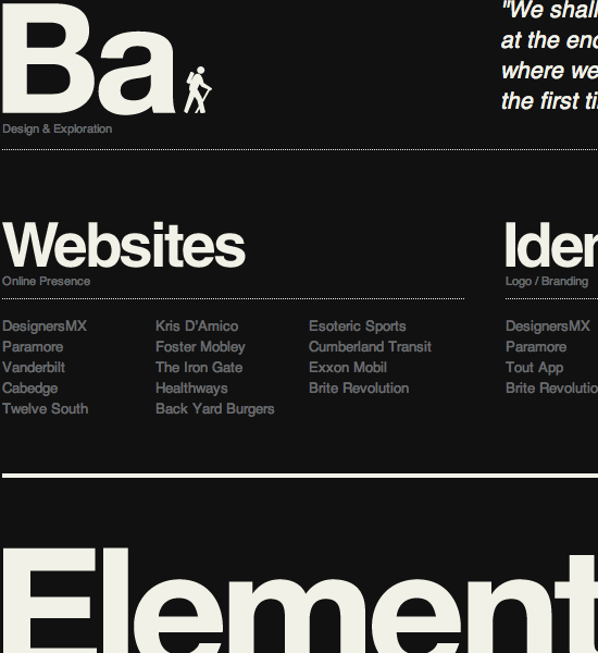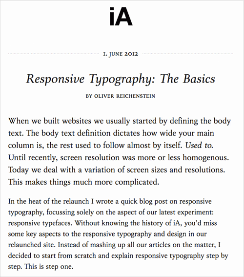 你已寻找这个问题多年,常听到这个问题在梦中被问及,也在以印第安纳琼斯般的远行去寻求答案。当你知晓答案,你感到彩屑从天花板上纷纷坠落,乐队也开始演奏你最爱的歌,你甚至从你的那一位那里得到了一个甜蜜的吻。那这是个什么样的问题呢? 恩,网页设计的秘密是什么? 这是一个艰难的问题,一个可能没有答案的问题。在2006年,Oliver Reichenstein写下了Web Design is 95% Typography.一些人狂爱它,一些人却不以为然。 若网页设计过多的依赖于文字设计,那么学习其他事物的意义何在?你所需要做的只是理解文字设计的各个元素,然后就能做的很好。 当然文字设计并不只意味着字体的选择,随着@font-face技术和一些如Typekit, Webtype, Fontdeck, 以及 Google Web fonts等服务的到来,你在文字设计的技术并没有提升,你可以在你的余生中轻易的只用一种字体创造出杰出的设计,如果你这样选择的话——而在很久之前那些人(设计师们)则不得不这样做,他们可没有Photoshop作为向导。如果有什么区别的话,更多的字体选择会使事情更加糟糕,这是因为一旦有了更多的选择,创造性以及美观就会变得很难实现。 更多的玩具意味着更多的乐趣,不是吗?如果你想走这条路,那就全力以赴,尽一切可能去达成。我喜欢看着不同的字体被使用,钦佩那些可以成功的在网站上使用新字体的人。然而,我已经太多次看到当开发方案提供给大众时会发生什么,这并不是很好(就像Myspace)。而Typekit能让你在开始使用一种字体之前就能使用文字设计来阅读一本书,这会很酷,假如如果没有用户协议的话——如果是这样的话,网站将会改进十倍。 并非是我尖酸刻薄,说这就是对大多数网站来说你所需要知道的。试着仔细查看你喜爱的所有网站设计,去掉其中所有的图片,然后问下自己:“只有文本和空白的网站会是什么样?”当设计师们说“文本是一种界面时”,他们来真的了。iA site (网站)就是一个杰出的例子。
