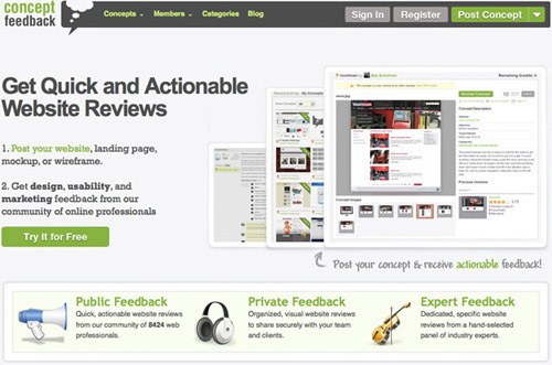 Concept Feedback Concept Feedback通过在线的专业团队快速的对网站设计,可用性和营销等方面提供反馈。对于公开的意见,团队中WEB方面的专业人员会给你一个整体的意见, 对于私密反馈,你可以邀请特定专家提供反馈,并组织出图形化的结果。 专业的反馈来自于在设计,可用性和营销领域的专家。