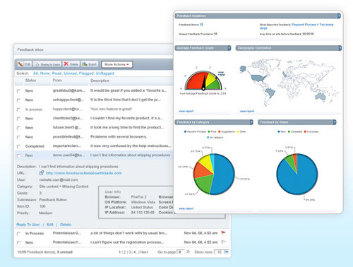 Kampyle Kampyle可以让你在你的网站出现一个在线发送反馈信息的按钮,点击此按钮可以弹出调查表,让访客可以反馈信息。Kampyle提供了反馈表单模板,你只需要简单修改即可,另外Kampyle还提供了丰富的反馈统计功能。