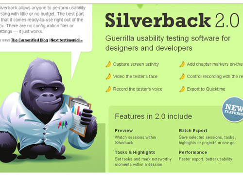 Silverback 一个用于设计人员和开发人员通过捕获屏幕活动来进行可用性测试的软件,可以记录测试者的表情和声音,有批量导出功能并可以标示出任何值得注意的时刻。
