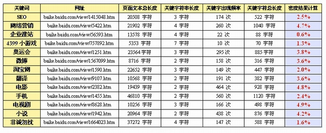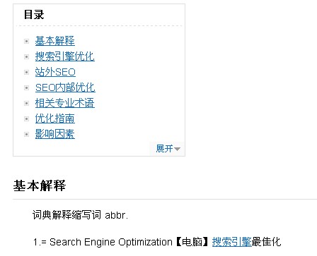 从上面的几组数据中我们可以看出,除了企业建站关键词密度小于1%外,其他关键词的密度大多在2-5%之间,这是比较合理的茫围,既不太高也不太低,如果你还想选取一个最佳密度,做到不偏不倚呢?可参阅潇然孤雁飞的另一篇文章<<关键词密度实战技巧–分析竞争对手 选取最佳密度>>有详解 。 一般站点首页设置2-3个关键词语比较合适,内页面优化就针对1-3个比较合适的。很多时候,我们为了更多的排名往往会在网站首页做到5到10个关键词,甚至有的更多。其实这样的站点一般很难获得好的排名,因为页面的要顾及所选的关键词的密度,就会产生了过度和刻意优化的痕迹。 4. 从文章布局分析 内容是网站的灵魂,在网站内部最有价值的部分,网站的内容是我们呈现给用户看的最直接的,也是用户最需要的东西。百度曾告给站长们的建议中提到:百度也只是一个普通的用户,如果用户都搞不清你在说什么,百度也同样不会。所以在编辑文章的过程中,一定要注意文章的结构清晰。 "一切皆为了用户体验",这也是百度官方反复强调的,连百度自身的产品都这么注重用户体验,如果我们只是单纯的为排名而优化,完全忽略了用户,那么网站到最后终究是被淘汰的,因为它已经失去了它本身应有的价值。 从百度百科的文章布局上可以看出:结构一目了然、语句清晰流畅,文章布局相当的整洁,格式也相当的规范,百度并不在乎文章篇幅的长短,主要侧重于页面内容的完整性。 1).内容简介 所谓词条概述,指在百科词条浏览页的词条名称下部、词条目录上部的中间部分增加一个正文模块,对已有信息进行简明归纳。简短的文章概述紧扣主题,通过一两百字,简洁清晰的告诉读者文章的内容。 2).目录索引 有了目录索引,从而清晰的阐述着文章的内容,让用户更快的找到需要的信息,也有利于搜索的需要。目录采用锚点链接,如果文章里有涉及到百度有的词条有锚文本,就是链接到百度其他词条文章的超链接。