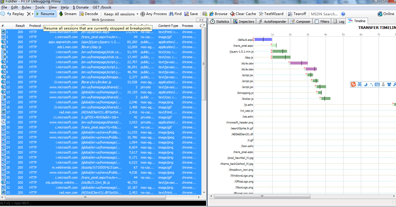 注意fiddler 右边的选项卡,有一个timeline。载入default.asp话费了大概1s的时间。让我们全选这些行。再去看看timeline,如下图