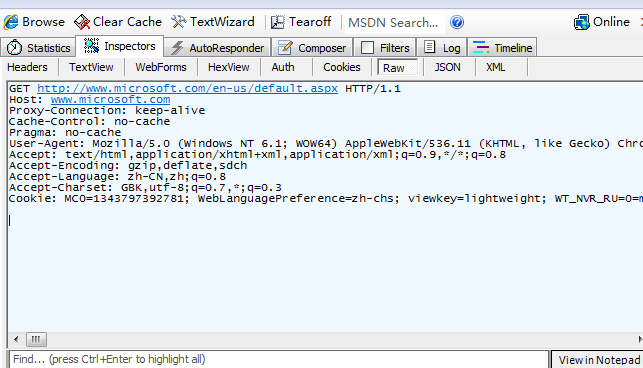 这时候我们根据数据就可以证明前边的观点,对于某个网站来说,80%的时间是用于加载css/JS/image的。 【Http 协议】 对于http协议的理解是非常重要的,因为它定义了web 浏览器和 web 服务器如何交互。 Hypertext Transfer Protocol 对于这点来说,最重要的是text,它不是基于二进制的协议,而是基于text的。 协议是1997年1月在 RFC(Http1.1)定义的。 请求/相应 模式。客户端浏览器发送特定的request,服务器返回response Header 和body。 每个request/response 有header和body 以下是 http协议的内容。我十分推荐你们阅读它: HttpRequest 我们使用fiddler观察一下我们访问微软的httprequest。 选中第一个记录。右边选项卡依次->Inspecotrs->Raw