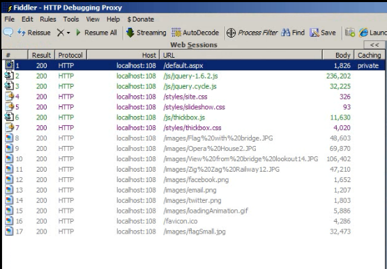 【概观】 什么使我们的网站变慢? Http 协议 通过更好的性能省钱和赚钱 性能规则 【什么使网站变慢】 对于大多数现代的网站,仅仅有10%-20%的响应时间是用于生成和加载html document的。 那么,其他的时间用于加载什么呢?确切的说,如下: css javascript(jquery,plugin 等等) images 让我们使用一个工具去看看-Fiddler () 首先打开fiddler,然后使用浏览器访问 这时候我们可以看到fiddler监控到客户端与微软网站服务器之间的交互情况如下图: