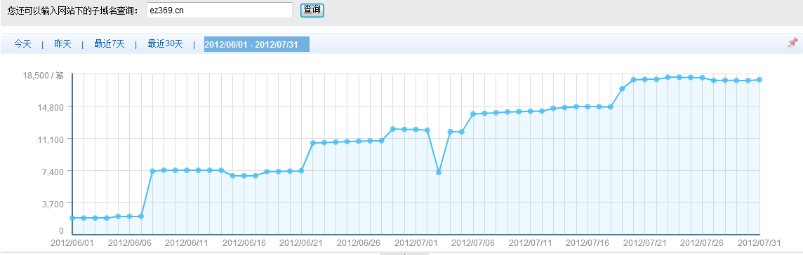 从图中可以看出来月1号起收录大幅度降低,这就是修改title和关键词后的后果 整个6月份,因为儿子生病,所以大半个月都在医院,只是偶尔回家的时候更新下网站,当时更新网站的方法大是30%采集,50%伪原创,20%原创,其实说原创,就是针对同一个关键词,把多篇文章的内容通过自己的整理发布出来,当时百度并未调整算法,所以相对来说还是遵循老站给与高通过率的原则.