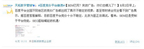 连SEO、SEM这么核心的关键字也不见了平日密密麻麻的竞价广告 近几年,百度竞价平台崩溃实属首例。正所谓,事出必有因,笔者很自然地联想到一个多月前在互联网业界轰动一时的6.28 百度K站事件,一夜间网站被K的草根站长们奋起反击,遂起义结盟誓要给百度回以“颜色”。遂发生7月18日开始的恶意点击百度竞价广告事件。众所周知,6.28事件后大量网站被k、降权,这直接危害到广大的个人站长。辛辛苦苦做的站瞬间就木有了,说不生气都是假的。