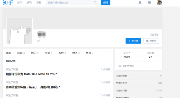 知乎的面子工程就包括:背景图、头像、居住地、所在行业、教育经历、个人简介、一句话介绍等。而这些都不要放过,这七个里面其中头像、所在行业以及一句话介绍比较重要。 我们先来讲讲头像。如果你运营的是企业号,那毫无疑问就是产品logo或者公司logo了。如果是个人的话,那就自由选择性会比较大一点。有人喜欢拿自己的头像来放上去,而有的人喜欢拿一些自己喜欢的代表物放上去,比如自己喜欢的偶像、动漫人物以及一些阿狗阿猫等。如果你玩知乎,是为了能够在互联网时代给自己提供一份社交背书的话,我建议你还是放一张比较正式个人头像。其他情况则根据自己的喜欢的兴趣爱好去定了。 一句话介绍。一句话介绍就是跟在昵称后面的最显眼的表现自己特点的位置了。这个一般来说都会充满“营销”的味道。很多企业一般都会放上自己的网站链接或者引导微信公众号关注语。现在很多个人也是自媒体,所以很多人做知乎的第二个目的就是为了能够为自己的其他平台引流,所以都会说“微信搜索xxx”等关注语。如果你只是玩知乎,那么就可以凸显自己的行业特性,比如你是做运营,那我就是自己就是“一枚运营喵”等。所在行业为什么重要呢?因为这个是你的定位,比如你是做互联网的,你的问题答案可能很多都是关于互联网科技等,而别人再找你的时候,也是根据你的标签来去找的,所以所在行业必须要给自己一个清晰的定位。 其他的诸如教育经历、居住地也是写清楚最好,别人关注你的时候也会有更大兴趣,很明显的一个例子就是你自己,在你遇到一些好答案的时候,你想关注这个人,然后进去他的主页浏览了一下,如下图,你还会有关注的欲望吗?所以面子工程是运营知乎的第一步。