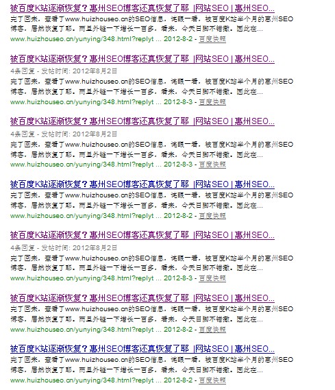 从图上我们可以看到博文《被百度K站逐渐恢复?惠州SEO博客还真恢复了耶》被重复收录达10篇之多,而这重复收录的,便是该篇博文的评论。其实在被k以前,没来及关注便被K了,这可是一大失误。 而从重复收录的链接上叶剑辉便发现都有着这么一个共性:“?replytocom=”。于是叶剑辉便立即进行屏蔽。可robots.txt这文件生效时间并不确定,而后怕过于延后继续重复收录边进入了站长工具中,手动对robots进行更新,所幸的是,百度也很快的抓取生效了。