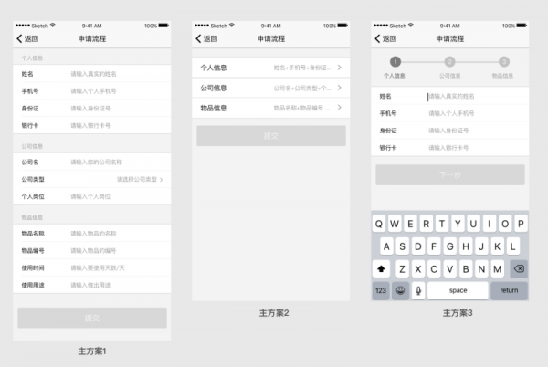 基于业务需求(常见于B端产品),有时候用户在操作过程中,不可避免的需要填写很多表单。针对移动端长表单,我们应该如何去正确的设计呢? 本文大纲: 三种主方案 主方案1的设计讨论 主方案2的设计讨论 主方案3的设计讨论 总结 一. 三种主方案 针对长表单的设计,按照设计思路的不同,可以分为三种主方案,如下所示: 图中举例的关键字段仅仅为举例需要。