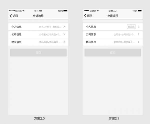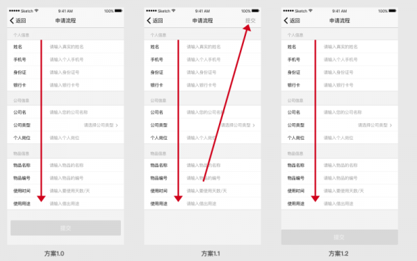 主方案1:我们常见的设计形式,一个界面将所有表单信息展示出来。 主方案2:将不同的分组表单放在不同的下一级界面,用户填写之后返回。 主方案3:分步操作,一个界面完成一组表单内容,点击下一步进入下一组表单。 二. 主方案1的设计讨论 主方案1的设计优缺点 优点:一个界面将所有表单信息展示出来,如果想查找某些填写的信息也变得更容易,相对于主方案2和3,减少了页面跳转操作和查看。 缺点:基于移动端界面承载能力较弱,一个界面将表单所有展示出来,用户一次性浏览和操作起来压力较大,容易使操作流程失败,导致成功率大大降低。 针对于主方案1,用户完成表单后,提交按钮有三种主要的设计方法: 提交按钮放在表单最后。 提交按钮放在导航栏上。 提交按钮底部悬浮。 如下图所示: