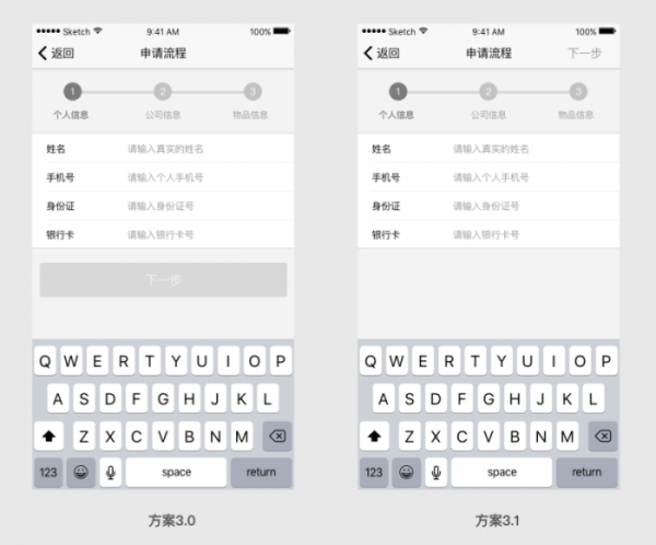 方案1.0,如果提交按钮放在表单之后,那么用户的视觉流和操作感觉是一致的,流畅而自然。但是会出现一个问题,用户在输入信息时,键盘调用会遮挡到提交按钮。Android手机上的输入法都可以点击输入法上的按钮将键盘推下去。而iOS 原生输入法没办法推下去,只能点击其他非编辑区域才能推下键盘。这样就显得很麻烦,用户可能会忽略掉提交按钮。 方案1.1,解决了提交按钮会被键盘挡住的缺陷,但是视觉流和操作行为错乱,用户在屏幕底部输入完成之后,视觉和手指要返回到顶部操作。 方案1.2,提交按钮底部悬浮,解决了方案1.1的视觉流和操作紊乱的问题,解决了方案1.0提交按钮被隐藏的问题,但是当输入文本,调出键盘时,依旧会被挡住。