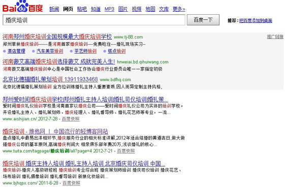 今天下午在百度上查看公司一主关键词“婚庆培训”排名时,发现在一轻博客上的开的博客竟然排到了第二页,当时没怎么太在意,但是感觉既然到了第二页就再添加点资料和一些比较醒目的广告吧!说不定还能再往上提提呢! 谁知到了晚上,查看该关键词时该博客排名竟然直冲到了百度首页第二名,确实让自己吃惊不小,因为自己之前一直拿公司网站做该词优化时,一天忙到晚的更新网站文章,发外链,最好时也就达到第十名,自己对此词的竞争性还是深有体会的。