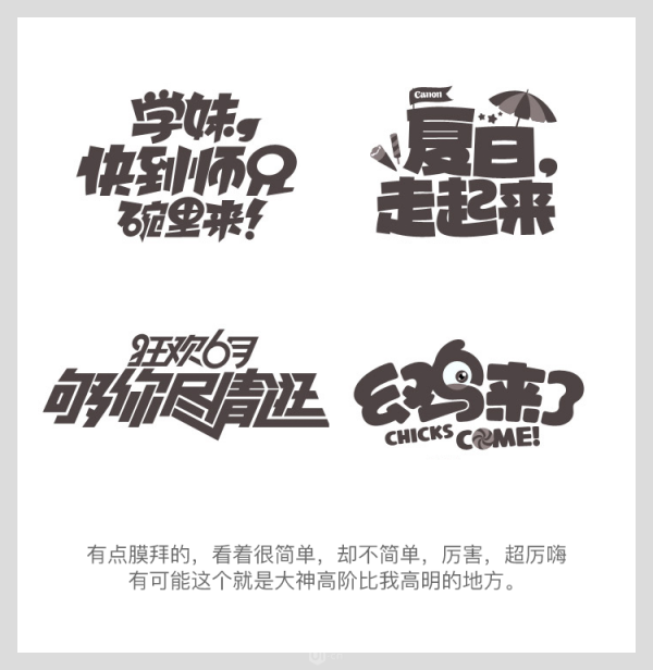 字体设计的精髓:精通结构,移花接木;组合外形,达到内涵。很多初会门径的设计师会感叹:哇,他这个字体设计的好牛啊、这个变化的好有趣、好卡哇伊啊……(一波夸张的表情脑洞飘过~~),怎么样在字体上移花接木,妆点它们,废话不多说了,直接看下面的几种方法(更加实用,比很多知识论坛里面的来的简单,粗暴,直接) 第一式:移花替换 妙手回春 移花替换是根据文字的内容意思,在统一形态的文字元素加入另类不同的图形元素或文字元素。用某一形象替代字体的某个部分或某一笔画,这些形象或写实或夸张。将文字的局部替换,是文字的内涵外露,在形象和感官上都增加了一定的艺术感染力。