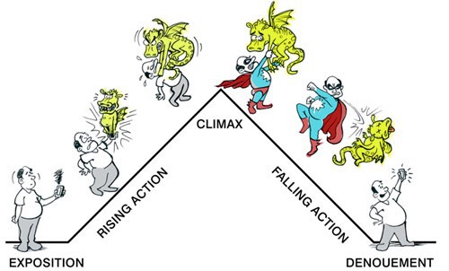 ·情节。许多设计师在进行设计的时候,会跳过上下文环境、使用场景和基础的设定与流程,直接进入细节设计,这样做是很容易出现错漏的。故事应该拥有基础架构,设定和剧情的,有起因,经过,结果。所以,在故事板当中,应该给你所设定的角色一个目标,有东西触发事件开始,并且通过执行,完成任务,或者阶段性结束任务,为角色留下新的问题。我们可以使用 Freytag 的金字塔来描述情节: