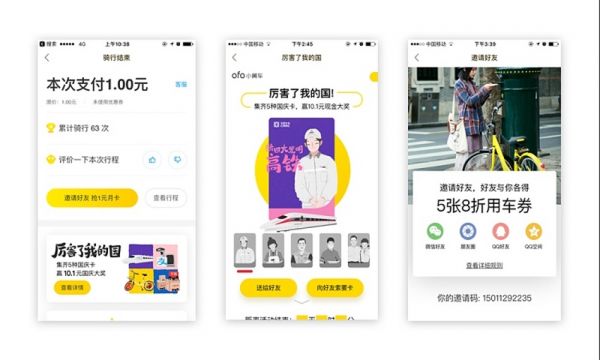 而且仔细看它们的明星选择,跨度很大。从小鲜肉的鹿晗,到丑萌的黄渤,还有综艺咖的大张伟,大胸女神柳岩……而不仅仅停留在鹿晗,吴亦凡,TFboy这单一维度。 目的就是吸引不同年龄段的粉丝,覆盖面更广,符合宣传主题里的「全民」这个概念。 引导转发,求扩散 上面所说的都是产品自己去投放的活动,还有一种方法扩大活动覆盖率,是鼓励用户自己转发。 例如:ofo支付后有个“邀请好友,抢1元月卡”活动,10.1国庆节集卡活动,等等。