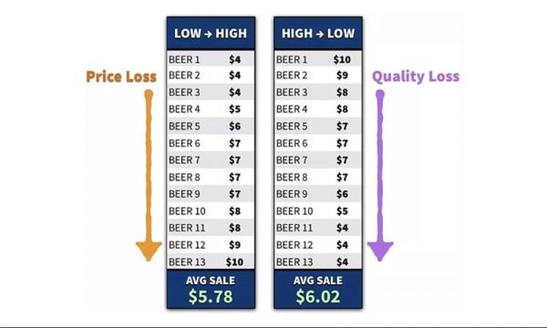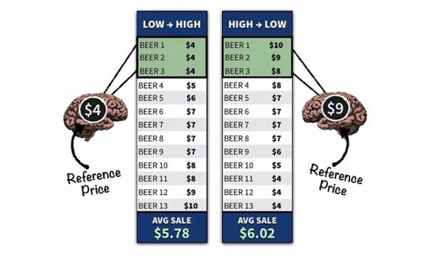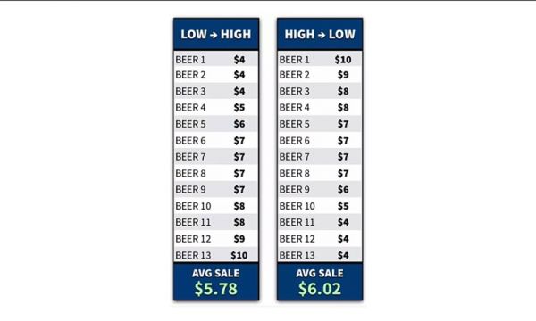 所以,视觉设计师在决定字号大小时,不仅仅是视觉美观的层面上,要学会从心理学的角度来提升设计的价值,将利益最大化。 b.将价格降序排列 有研究表明,如果价格按照降序排列,用户会受到影响选择一个相对较贵的。 Suk,Lee,and Lichtenstein(2012)在一家酒吧中测试的这个论点,通过随机改变产品的排序进行测试。当他们将产品按照价格从高到低的顺序排列时(右图),获得的营业利润最高。