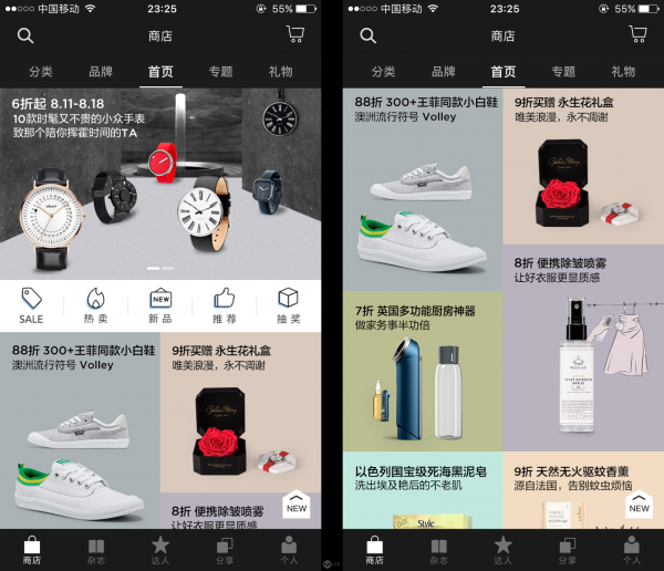 图1-8Life 滑动隐藏标签栏 良仓的首页并没有采用这种滑动隐藏标题栏的设计(图1-9),我猜测因为良仓的底部栏目太多,没有给购物车留下一个单独的位置。所以可能为了强调购物车的全局显示,所以固定栏顶部标签栏。当然我认为这种想法可能也说不通,因为首页是不太可能促成交易行为,更多是引流的作用。我认为良仓底部的分享是一个很鸡肋的功能,本质就是一些美图商品推荐而已,如果把这个频道降级放进其他位置,把这个位置留给购物车。我估计设计师就可以舒心的使用隐藏标题栏设计。