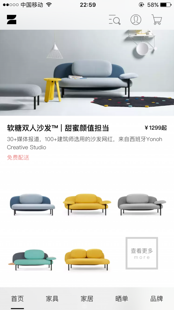 图1-9良仓固定的标签栏 模块3:横幅广告 由于垂直类电商的信息密度低,所以有足够大的空间去放置Banner。Banner的常见比例有16:9和1:1两种。也就是750*422和750*750。一般Banner图片设计还是以750宽度的iphone6/7为基准。至于更大尺寸的iphone6/7plus还是使用这个图片,因为从节省带宽的角度完全没必要那么大的尺寸。2X的Banner图给3X用也是足够的。什么是2X、3X?这些移动设计知识,请去阅读我撰写的UI设计书籍《术与道-移动应用设计必修课》。那么图片的比例什么时候使用16:9,什么时候使用1:1了?还是从内容的角度进行分析。视觉设计1 16:9的Banner图如果你的应用展示的Banner图是类似专题性质的。图片只是一个参考作用,用户是不能从大图看到更多商品信息,需要更多文字说明来辅助阅读,图片比例选择使用16:9。例如旅游的产品图片就适合选用16:9。比如首页你要做一个欧洲的路线,你只放巴黎的埃菲尔铁塔的图片,那么提供信息量是远远不够的,必须加上德法意深度10日游的文字说明。例如造作(图1-10)展示的都是家居套装专题,而不是具体某个家居的单品。所以使用16:9 Banner图片比例。