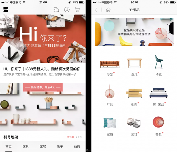 图1-6造作的首页和分类页有的垂直类电商品类并不多,所以干脆直接去掉了搜索入口。在2016年的唯品会的App甚至极端的去掉了搜索功能,希望用户在页面可以停留更长的时间。这种想法显然有点一厢情愿,因为唯品会的品类可不少,这样的设计遭到了很多用户的反对。在最新版本的唯品会又悄悄的把搜索功能加了回来。所以留不留搜索入口还是要看你的品类是否足够丰富。 模块2:分类模块由于垂直电商的品类不是那么多。子频道也有限,所以不需要和综合类电商一样,用图标的形式作为模块快速入口,而是直接设计为Tab标签栏的设计形式,放置在标题栏下面,方便用户快速浏览切换。视觉设计1 底部标签栏Tab标签栏如果类别比较多的时候采用横滑的设计形式。如果应用的频道比较少,例如造作应用(图1-7),甚至可以直接把标签栏设计在底部,相当于整个底部标签栏的作用,当然底部标签栏重要的“我的”模块,入口放置在顶部标题栏上。