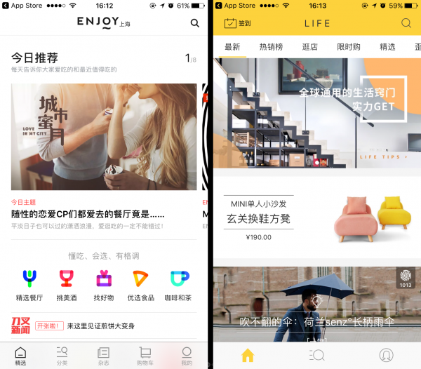 图1-5美食电商Enjoy和兴趣导购life首页如果你的商品品类并不是很多,那么用户通过关键词搜索很难搜到东西。所以一些应用干脆把搜索和商品分类页进行结合设计。例如造作(图1-6)点击搜索,进入的搜索页就是商品的分类页。