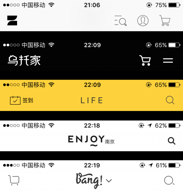 图1-4 造作标题栏使用了logo图形,其他使用了字体设计的logo视觉设计2 搜索入口大多数垂直类电商,更希望于用户浏览推荐内容,购买推荐活动商品。而不是直接通过搜索去找到相应商品,去完成购买行为。所以垂直类电商App会有意识的弱化商品搜索。不同于B2C综合类电商导航栏上醒目的搜索栏,美食电商Enjoy和兴趣导购life首页(图1-5),直接在导航栏右侧放置了一个搜索图标。