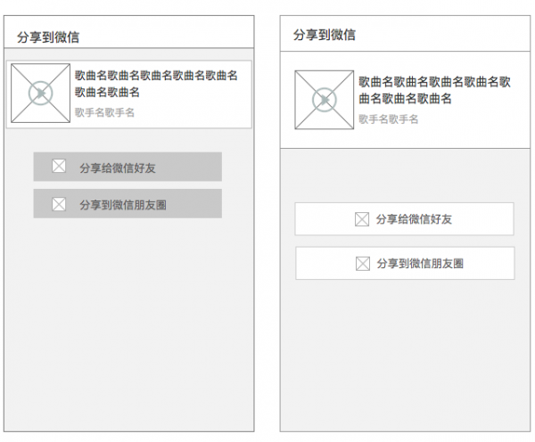 注意颜色、留白这些细节。 讲到这里,有人会问,交互把时间浪费在这种视觉层面的事上有用么? 我倒觉得这是设计常识,或者你有没有意愿提高自己在这方面的能力。若有,则随手一画就是如上图右边的界面,何谈浪费时间。你永远无法预测一种技能在未来会派上什么用场。 当然,如果你会用交互组件库(如何打造一个方便高效的交互组件库?),也会省很多时间。 热区 标明热区的范围。 比如,为了图省事,没有标明右上角“关闭”的热区范围。然后开发就把热区做成和X一样的大小了。就有用户来反馈这个X点不中。