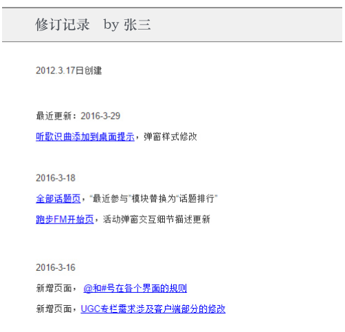 修订记录 放在文档第二页。 写明文档的修订者,方便开发找到对应的交互;列出文档更新的具体日期(最近更新的排最前),给出被修改页面的超链接,同时写明具体修改的内容。