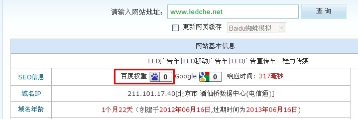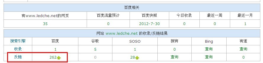 以上为百度官方于2012年7月12日发布的一篇声明,明确表示第三方站长工具的数据并非百度官方数据,不代表真实的网站情况,所以请大家再也不要相信所谓的百度权重。 2.以反链查询工具查询的数量来判断网站的外链情况。其实站长平台提供的反链查询工具查询到的数据只是百度相关域,这些相关域并不能传递权重,所以不能算真正意义上的外链。现本人有一个led广告车的产品网站,我是8月1号上线的,之前并没有发过外链,但在我把网站提交上去,用这个所谓的反链查询工具一看,居然有200多个反链,不信请看下图: