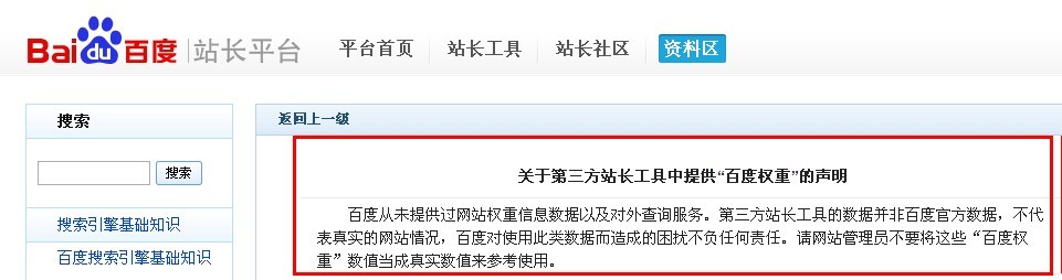 图中红色方框中的里面是显示百度权重的,很多站长都拿这个数据来判断一个网站的好坏,但大家有没有想过,这些工具是百度官方的数据吗?其实不是的,百度权重最早是由爱站提出,到后来各站长工具平台也相继推出百度权重查询工具。这个所谓的权重都是以流量来作为标准的,如果你网站的流量高,这个所谓的百度权重自然就高,如果你的网站没有流量,百度权重就为零。很显然把这个作为判定标准是非常片面、而且是非常不科学的。百度权重计算是通过很多考核因素进行全方位考量的,具体会考量什么因素,百度当然不会告诉我们,因为这是百度的核心机密,所以我们不能拿这个所谓的百度权重来作为判断网站质量的依据。可能还有很多人会认为这个是百度官方的东西,为此百度站长平台有进行澄清,请看下图: