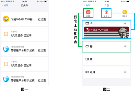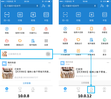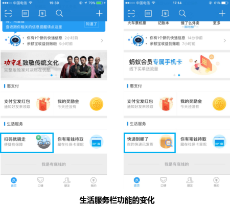 首先,是我们都处理了毫无用处的“过期卡券”功能(如图一),这个功能是有些无厘头的,既然已经过期了,为什么还要用一个专门的入口呈现给用户看呢。支付宝的处理方式是删除入口,而我的想法是用小票功能代替——首页无数琐碎的消费记录,比如在全家买的矿泉水。其原因是,钱包很多时候都会承担储藏小票的功能,在电子支付还未盛行的年代,哪个人钱包里没有几张小票呢? 其次,双方都使用了分类的形式。不一样的地方在于, 支付宝10.0.12是按照使用频率呈现或隐藏卡券。而10.0.0(改)是按照使用频率排序。 接着,对于顶部栏的处理,支付宝10.0.12使用了新的入口,这不合理(如图二),一定会改,大家且拭目以待。 最后,10.0.0(改)在显著位置有女友照片,很明显在情怀上何喵喵获得了胜利。