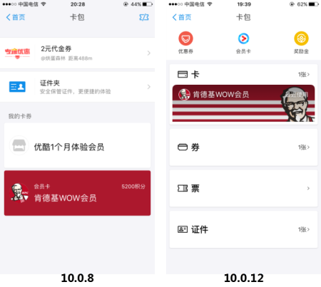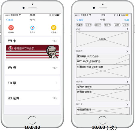 卡券功能升级,由10.0.8较少的卡券丰富为按类别归类的卡包。对这一功能升级,我们在10.0.0时进行了分析、预测,甚至设计了类似的卡包功能。其逻辑是实物钱包的线上化。 对比我在10.0.0时的设计可以发现,有几个共同点和不同点。