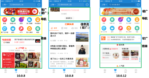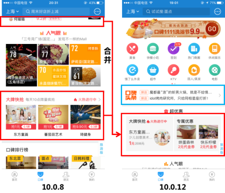1、在口碑页显著位置、几大榜单前添加口碑头条的滚动显示栏 这一更改非常的棒!口碑头条作为决策信息的参考和引导,它本身就应该在决策之前使用。也就是,正确的流程是:先看消费相关的信息流,再决定如何消费。而不是先决定消费,再看有哪些推荐。10.0.5的显示位置却非常鸡肋——在页面的底部,在用户浏览完分类和各种榜单后,基本是已经做出消费决策了,即使没有做出,也很少会再花时间浏览口碑头条的信息。 2、专属优惠和大牌快抢合并为超优惠,删除口碑排行榜 减少过多的维度、合并相似维度,专属优惠和大牌互抢都属于价格维度,人气榜和销量榜相似且容易混淆。(如图)