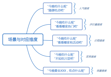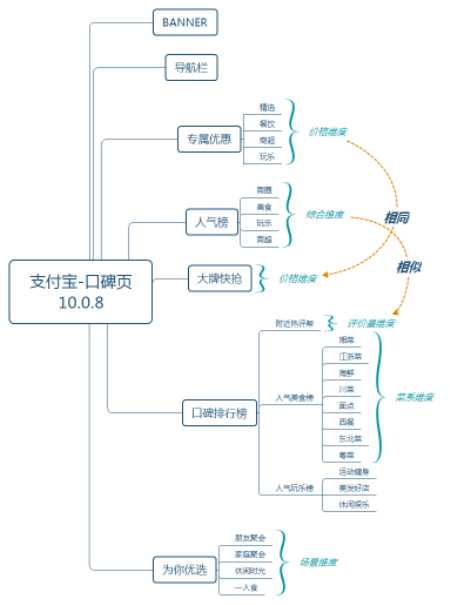 “猜你喜欢”变更为“为你优选” 口碑页目前为止总共有两次大的变化,第一次是在9.9.3-9.9.7,榜单的推荐维度由单一的评价量增加为综合维度、评价量维度、价格维度和菜系维度。 第二次就是10.0.3-10.0.5,猜你喜欢变更为为你推荐,即场景维度。这么做同样丰富了用户的选择。 但同时留下了维度过多,用户容易无所适从的隐患。