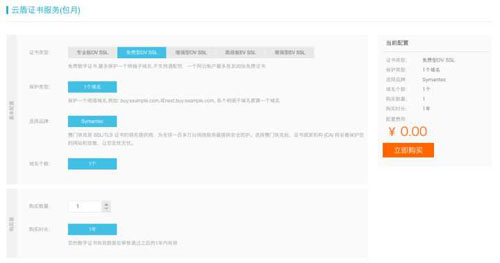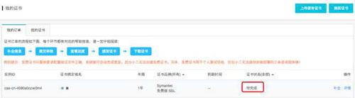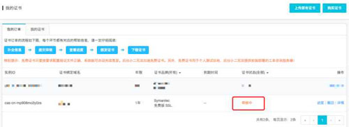 (4)选择“免费型DV SSL”,并点击立即购买。购买成功后跳转到“我的证书”页面: