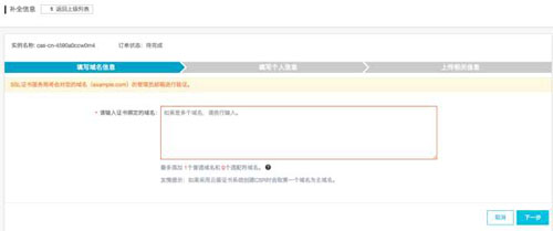 (5)此时的状态处于“待完成”,点击右侧“补全”按钮,补全域名信息: