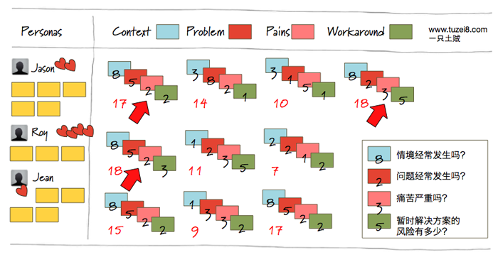 【编者按】本文转载自@一只土贼 的个人博客。和以往的那种简单粗暴的“头脑风暴”,或者索然无味的“需求评审”不同,敏捷体验设计中的过程永远是开放的,强调在和客户的互动中识别需求,并产出设计,最终对项目交付内容达成共识。 过去的五年里,作者参与了几十次和客户的设计工作坊,这里把其经常使用的五种设计工作坊形式分享给大家。 模版1:用户价值定义 用户价值的定义是任何软件体验设计的基础──到底解决了什么用户的什么问题。对于问题的定义越准确和清晰,越能够对产品或特性设计方向达成一致,当所有的客户都认为,解决用户A在情境B下遇到的问题C是本次交付的核心目标,那么自然,与解决这个问题之外的任何设计、功能、甚至讨论都应该放入低优先级。这个活动可以经常性进行,可长期保留这个用户价值板,将识别的用户问题放在板上统一进行管理和评价。 过程 梳理出典型用户放在画板的最左侧; 头脑风暴出用户可能遇到的问题; 对于每一个问题进行扩展──什么情境下出现这个问题?问题带来的痛苦是什么?为了解决这个痛苦用户现在是怎么做的? 将每个问题进行扩展后再对每个维度进行数字评估──情境和问题发生的频度?痛苦程度?和临时解决方案的风险大小? 总结所有的问题,将数字相加,配合典型用户的优先级,梳理出最应该关注和解决的问题,再进入设计阶段。 元素解释