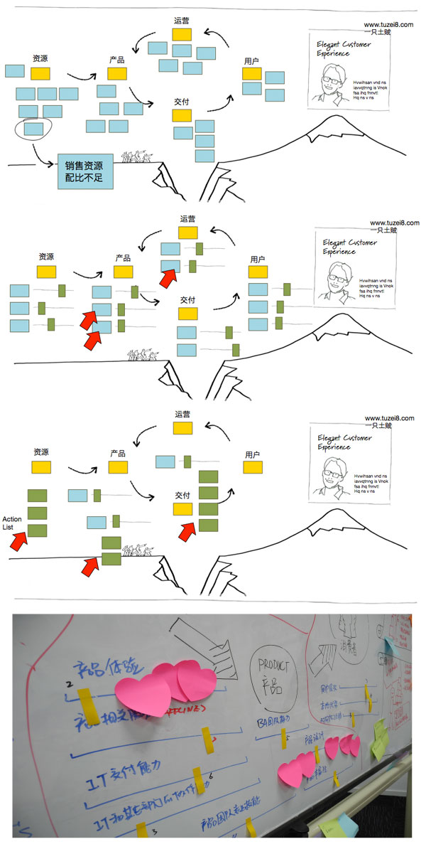 上图中红色箭头便是具体要进入细节设计的用户问题,当这些问题被解决,所产生的用户价值一定是在当前产品中价值最高的。 模版2:组织改进计划 做产品本身就是在做商业模式,而商业模式的基础是组织运作,在产品设计之前需要对组织现状进行了解,帮助客户寻找到为了达到产品愿景的目标组织级别还有什么地方需要改进,为接下来的产品设计做准备。 过程 使用“Tomorrow Headlines”的游戏让客户团队对未来产品或组织愿景达成统一认识,将达成统一认识的海报贴在画板的右上角,如演示中右上角所示; 使用一种运营模型收集对现状的描述(使用名词+形容词的表达),在演示中使用的是,资源-产品-消费者的价值传导模型,可以根据情况选择合适的模型; 将所有贴条进行归纳分组,梳理出一些维度,例如说:销售资源分配不足可归于“销售资源”维度。对每个维度使用滑块进行竞争力评价,越往右说明竞争力优势越大,越往左则反之; 找到竞争力最差的维度进行单独讨论,这些维度就是阻碍我们达到共同愿景的绊脚石; 对每个绊脚石头脑风暴出行动列表,在一定时间内进行改进,并制定责任人,定期进行反馈; 提示 1、这个活动可以用于任何级别的组织,只是愿景不同; 2、对于模型的使用可以自由抽象,大部分组织行为都可以抽象成,资源、活动(服务或产品)、服务对象、反馈等; 3、定期(每两周)对实现愿景的行动列表进行展示或验收,及时收集反馈,持续改进; 4、行动应该是准确和结果可验收的,“和销售团队达成对销售支持人数4人的共识”要比“找销售团队要人”要明确得多; 演示