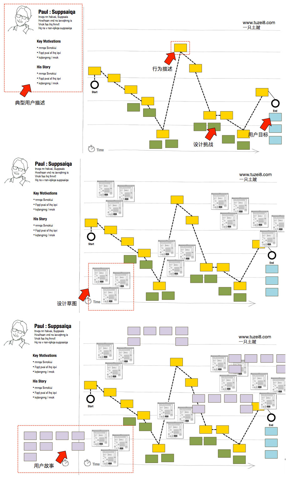 模版3:客户体验地图 从客户(Customer)的角度出发,定义客户在完成用户目标过程中经历的步骤,在情境中发现客户的痛点,并将痛点转化成设计挑战,为接下来的设计活动做准备。在完成设计稿之后,从设计中梳理出来的用户故事也能被完整地展示在图板上,给团队完整的上下文,了解每个用户故事都是在解决哪个典型客户的什么问题,优先级也一目了然。 过程 将梳理好的典型客户放在画板最右边; 梳理出对于这个客户存在的用户目标; 用贴条展示出客户现在完成用户目标过程中经历的步骤; 在心情曲线上将所有步骤串联起来,心情越好贴条贴得越高; 分析心情最不好,即贴条位置最低的几个步骤; 对每个位置最低的步骤,梳理出设计挑战,尝试为客户解决其中的问题; 对设计挑战进行优先级分析,建立设计挑战墙进行设计; 将设计草图贴在设计挑战周围; 从设计草图中梳理出用户故事; 提示 1、从最核心的用户类型开始; 2、心情最低落的位置代表这个步骤中存在一个问题; 3、最完美的情况是寻找一个和典型用户最匹配的真实客户一起参与到这个活动中来; 4、有大量关于客户体验地图的资料可以参考:例如这里。 演示