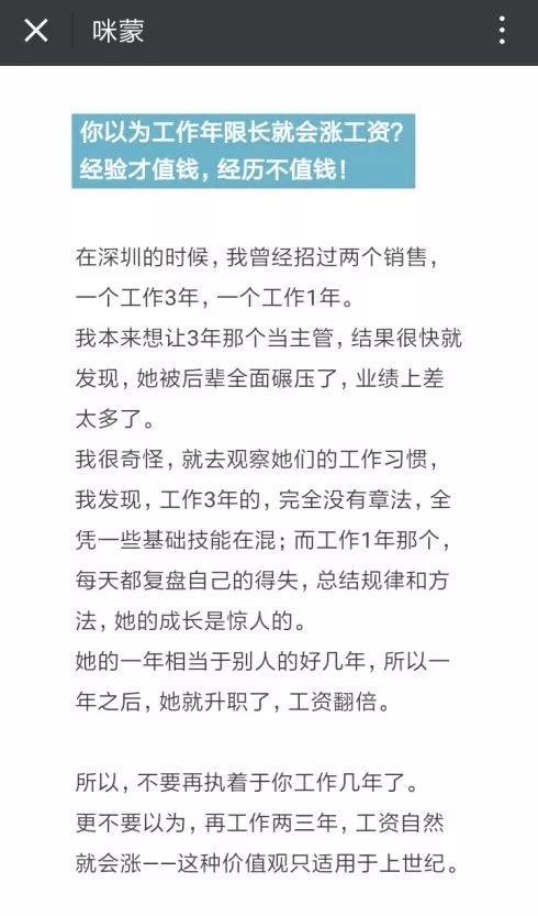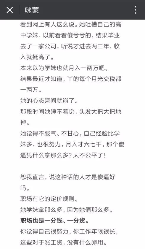 特别是其中说到: “她觉得不服气、不甘心,自己经验比学妹多,也很努力,月入才六七千,那个傻逼凭什么拿那么多?太不公平了! 恕我直言,说这种话的人才是傻逼好吗。” 其实这不就是暗示:谁这个想,其实就是那个傻逼! 因为大多数人都会有这样的想法,所以马上就会被调动起来。 这样一个背景写下来,相信很多人都有一定的兴趣了,还会有一定的焦虑感。 心里默喊:怎么办?怎么办! 这个时候,咪蒙继续添一把火。 她开始丢各种C(Conflict冲突),描述或者说制造了4个现在大家特别常见又特别关心的一些职场加薪真相。 我觉得应该是覆盖到了几乎所有想加薪的年轻人。比如: ● 你以为工作年限长就会涨工资?经验才值钱,经历不值钱! ● 你以为努力了就能涨工资?屁!老板觉得你的努力毫无价值! ● 你以为能力好就会涨工资?别傻了,你的能力要让老板看见! ● 你以为涨薪是由别人决定的?错!涨薪是可以主动规划的!