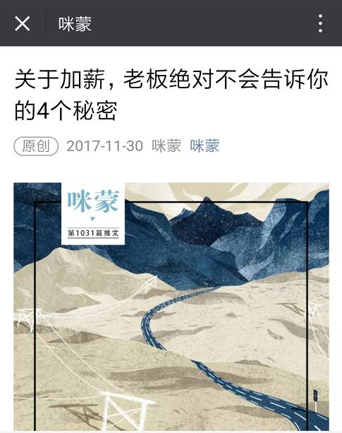 前不久,咪蒙在其公众号推送了一篇名为《关于加薪,老板绝对不会告诉你的4个秘密》的广告推文,主要是卖她首次的加薪课《咪蒙教你月薪5万》。 标题算是很简单也很常见,典型的好奇型标题,直达读者“加薪”的痛点,引发好奇心。