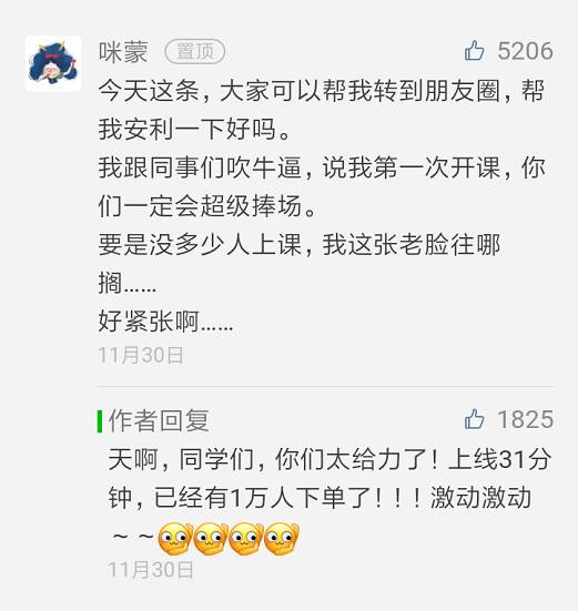 第一次开课卖课程,30分钟卖出1万份课程! 是的,咪蒙又做到了,这份成绩非常傲人。