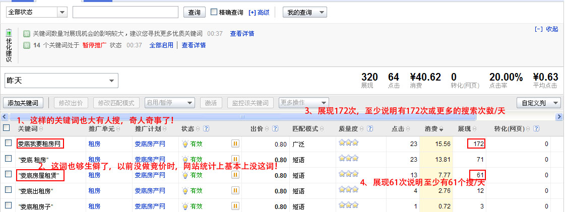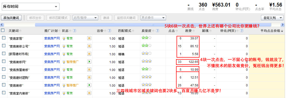 个人疑点: 1、这关键词以前根本没人搜索,就这两天起来的,以前网站统计上也从来没这词!! 2、娄底房屋租赁这词,很生僻,以前没做竞价,网站流量统计,从来没这词!! 以前百度单价调整没提示,也出了不少冤枉钱,向百度申诉无果,所以现在懒得申诉了,直接"漂白",截图: